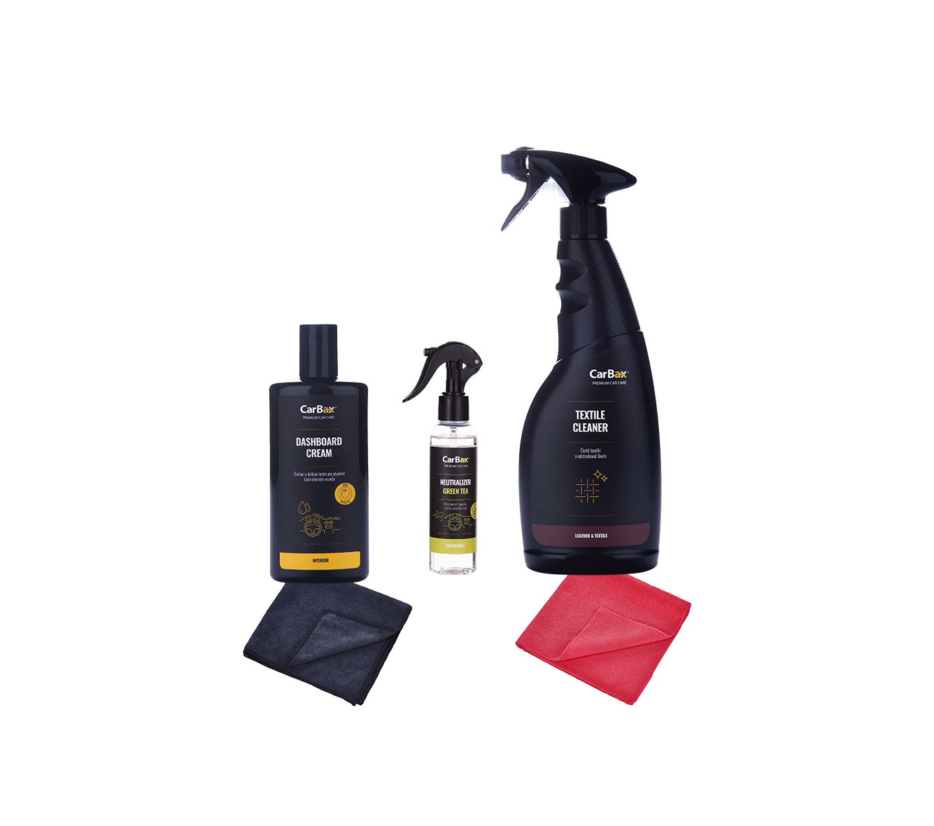 Sada autokosmetiky obsahuje produkty pro důkladnou péči o interiér auta s textilními povrchy. Sada obsahuje krém na plastové části interiéru auta Dashboard Cream s aplikační mikrovláknovou utěrkou, pohlcovač pachuů Neutralizer Green Tea a čistič textilních sedaček a textilních povrchů spolu s čistící mikrovláknovou utěrkou.