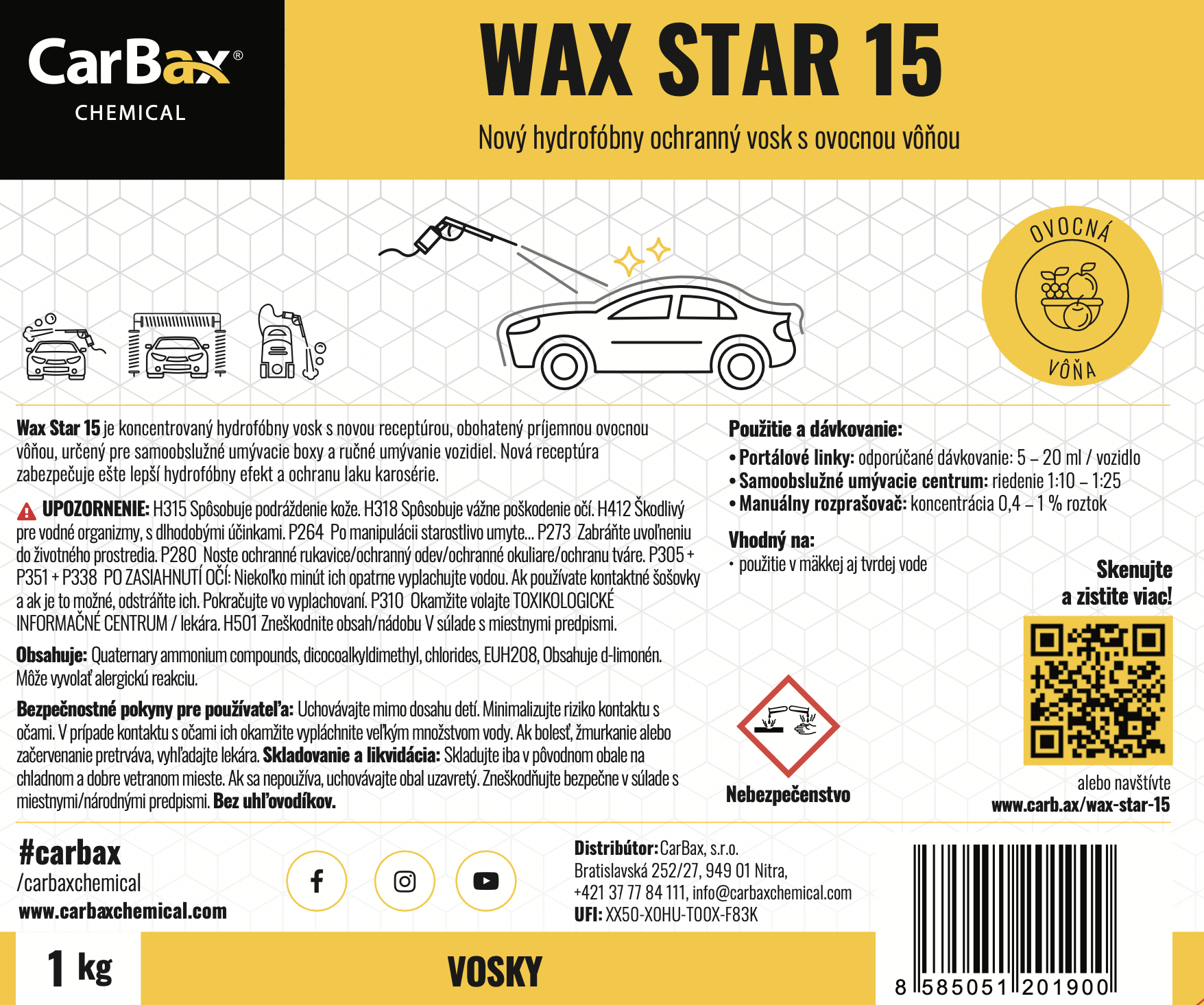Koncentrovaný hydrofobní vosk s novou recepturou, obohacený příjemnou ovocnou vůní, určený pro samoobslužné mycí boxy a ruční mytí vozidel.